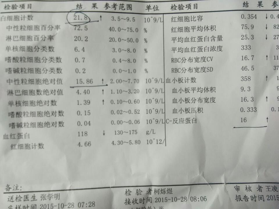 宝宝白细胞21.8中性粒细胞绝对值15.86反应蛋白16怎么回事 宝宝白细胞21.8中性粒细胞绝对值15.86反应蛋白16怎么回事 点击展开 乐观的玉玲 2015-10-28 15:25 为您推荐: 其他回答 问问医生吧! 粑粑麻麻❤️宝宝 2015-10-28 19:33 问问医生。 看看海 2015-10-28 17:51 問一下醫生 爱紫轩宝贝 2015-10-28 16:30 问医生。。 ^O^魔妈^O^ 2015-10-28 16:17 相关问题 宝宝1岁5个月了 连续发烧啦(白细胞13 6/中性粒细胞绝对值75 54/超敏C反应蛋白35 2) 一岁宝宝白细胞计数21 8,中性粒细胞绝对值15 86,反应蛋白16,中性粒细胞百分率72 5 怎 白细胞10 13偏高,中性粒细胞绝对值7 28和…