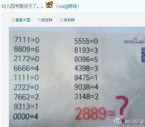 被幼儿园的小朋友给难住了,哪位大大来帮个忙,求答案及方法 点击展开 匿名用户 2012-06-26 17:57 满意回答 答案是5,这就是一个简单的数数游戏,数辉缘灿一下每一组遮兔数府悼字有几个圈圈就能得出答案了,别吐血哦! 匿名用户 2012-06-26 17:59 宝宝知道提示您:回答为网友贡献,仅供参考。 相关问题 宝宝去幼儿园和小朋友不合群怎么办?求答案 在农村开办幼儿园可以吗,前景怎么样,帮个忙谢谢了 张掖市山丹县有多少个幼儿园和小学,都是哪些?请山丹的朋友帮个忙啊,跪求