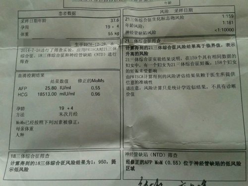 唐氏筛查检查结果说,21-三体综合症为159,请帮忙看看风险大吗?需要进一步检查吗?急! 点击展开 南方花开 2014-08-06 15:18 满意回答 需要,你年龄也是高风险!21三体高危,做羊水穿刺进一步检查! 祈怀桃_3PbF 2014-08-06 17:08 宝宝知道提示您:回答为网友贡献,仅供参考。 相关问题 唐氏筛查为低风险,bb出生确诊为21三体综合症 可以想医院索赔吗? 您好我做了唐氏筛查说是21-三体综合症是高风险,我该怎么办 唐氏筛查21三体综合症临界风险,严重吗