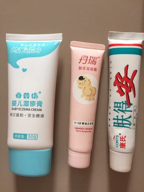 为了我家宝宝的湿疹我也算是豁出去了 买的这几个擦了都不管用。那次带宝宝打防疫针去挂了个皮肤科!一个中年女医生给开的药 抱着试试看的态度擦了之后 第二天好了很多 昨天果断又去开了些回来擦!虽然价格都差不多和那些 分量好少些 不过 宝宝的湿疹得到了缓解还是很开心啊!