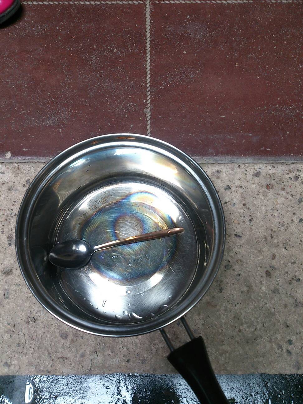 宝宝的不锈钢奶锅,匙羹在电磁炉消毒的时候没水干烧了,发现后变色了,还能用,问题是这样以后用金属会产