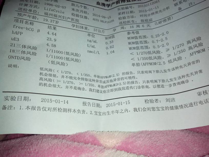 今天领了唐氏塞查的报告单,看了好多宝妈会看这个单子是男孩女孩蛮发下,有人懂得看呗?帮我看看是男孩女 今天领了唐氏塞查的报告单,看了好多宝妈会看这个单子是男孩女孩蛮发下,有人懂得看呗?帮我看看是男孩女孩啊! 点击展开 拼未来! 2015-01-24 19:01 为您推荐: 其他回答 看不出来的宝妈 陌路了 2015-01-24 22:49 你好,根据你提供的信息不能判断胎儿的性别,建议在怀孕4个月左右B超检查。 五彩缤纷20143 2015-01-24 20:10 祝你好运! @#$%$$^* 2015-01-24 19:33 没关系,,,, 韩多多妈咪 2015-01-24 19:13 不准的.. 梦缘_5ffr 2015-01-24 19:07 加载更多 相关问题 唐氏塞查报告单,谁会看,帮我看看男孩女孩,谢谢啦 有经验的宝妈们帮我看看,是男孩女孩!谢啦! 谁帮我看看,男孩女孩,娱乐一下