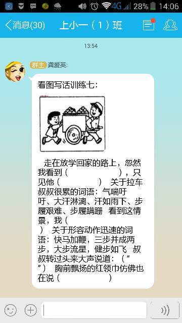 第一个空写 一个叔叔正艰难地拉着一辆装满货物的推车 第二个空写 气喘吁吁地拉着一辆手推车,步履艰难,额头上汗如雨下 第三个空写 赶紧三步并作两步上前帮助叔叔推车 第四个空写 谢谢你,小朋友 第五个空写 你真棒