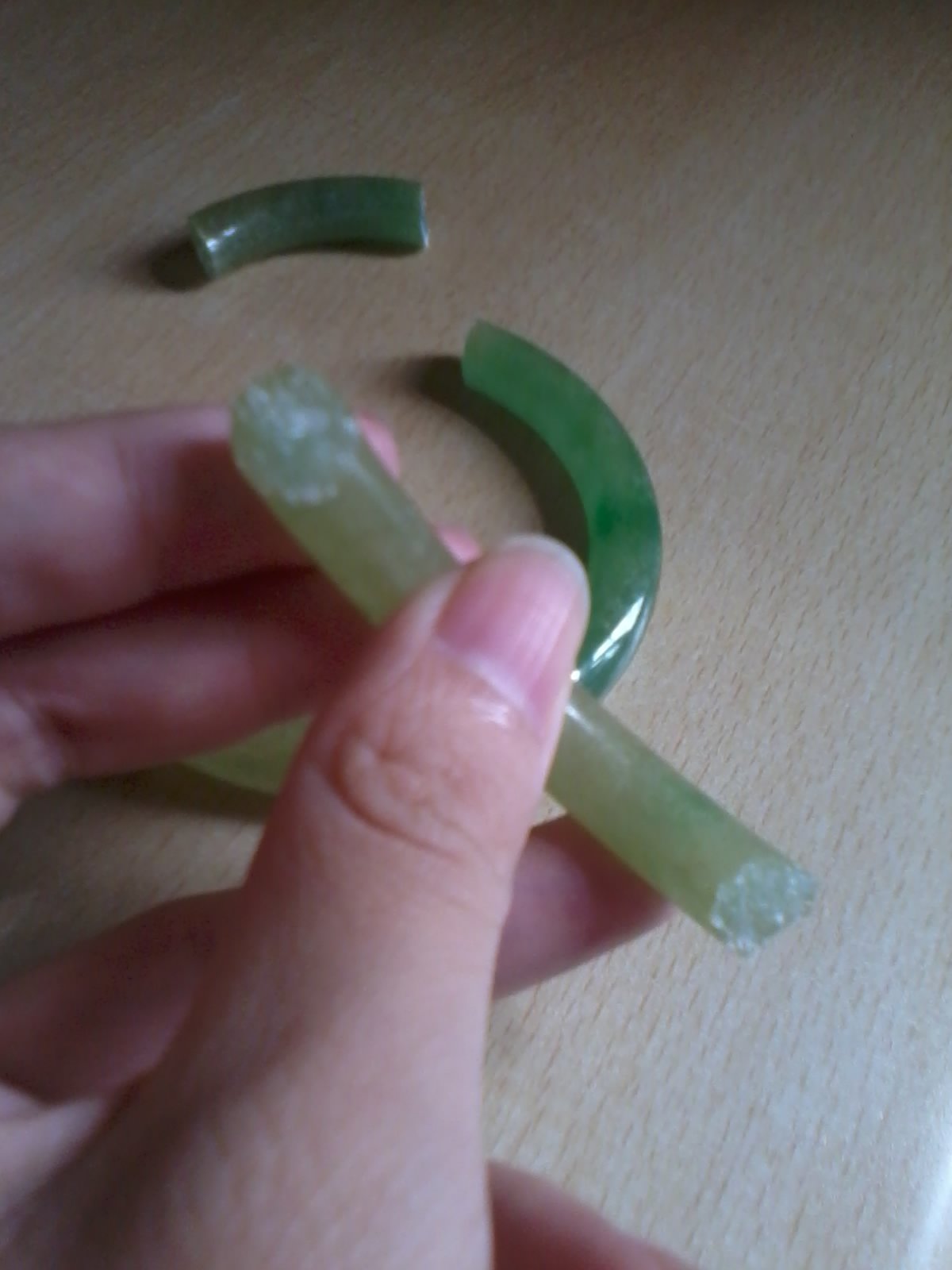 戴了三年的镯子虽然不值钱但是挺喜欢的,去年不小心碎掉了。昨天拿出来泡水清洁的时候才想起来我还不知道它的矿石品类(别人送的时候没说)是什么,好奇,遂有此问。断裂处的晶体颗粒形态挺粗的。这个光线下的色彩最爱。