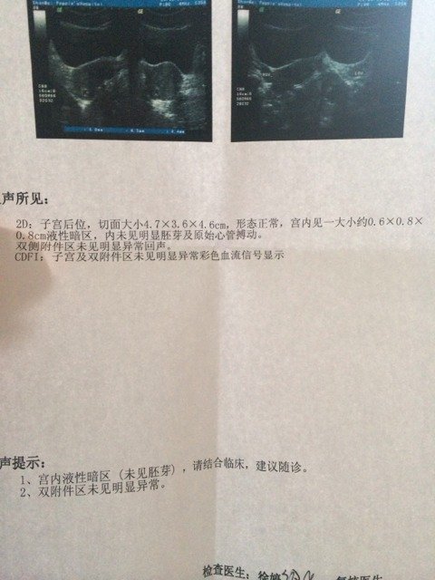 12月16未次月经,26号同房,1月13有点点血15号查出弱阳性今天B超说宫内有液性暗区是怎么了? 12月16未次月经,26号同房,1月13有点点血15号查出弱阳性今天B超说宫内有液性暗区是怎么了?好担心,会是瘤吗?有没有怀孕 点击展开 136*****116_iLvO 2015-01-23 21:06 为您推荐: 其他回答 在等等 看看 娜娜。z z z 2015-01-24 13:43 祝好孕'' 祝好孕😁 2015-01-24 12:48 一开始我的也是暗区,各种担心,过了两个星期就有胎心胎芽了 宝宝乳名叫早早 2015-01-24 12:28 多休息。。。 寶寶期待你的到來 2015-01-24 10:38 注意多休息 蔓株沙华 2015-01-24 08:48 加载更多 相关问题 3月23末次月经,4月30至5月3出褐色血5月3去医院测孕棒显示弱阳性验血5号出结果,b超未测出 今天满月,早上起来看见裤子上有血,不知道那是来了月经还是什么,昨天同房了有影响吗? 产后36 天同房后第三天底下有鲜红色的血,是来月经了还是怎么了?