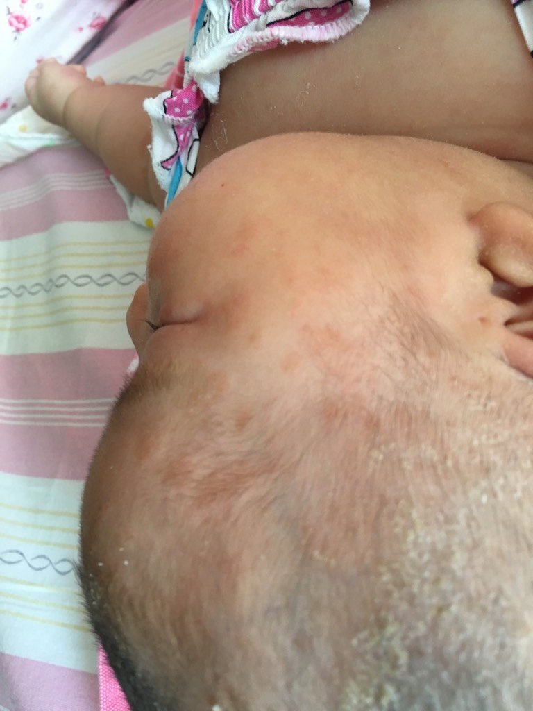 宝宝上周在儿童医院普通诊看过,说是脸上脖子身上起的是湿疹,脸上给的尤卓尔和氯霉素软膏,脖子擦的是一