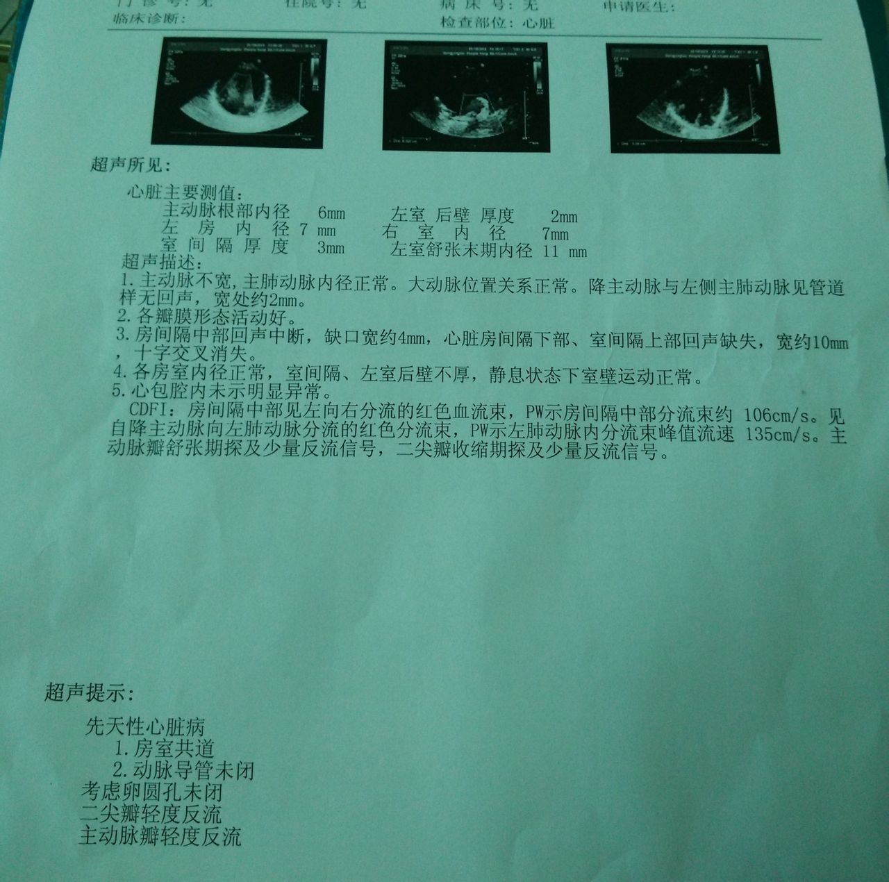 先天性心脏病,刚出生婴儿,男性,麻烦能根据彩超给点意见,我们做好就医准备 点击展开 匿名用户 2015-01-18 17:02 为您推荐: 其他回答 你好,先天性心脏病是儿童最常见的心脏疾病之一,通常是由于孕早期各种因素导致的心脏结构发育异常而导致的心脏结构异常,一般通过手术修复预后是相当不错的,可适时手术治疗。 李永魁医生 2015-01-19 08:43 相关问题 有心脏科的专家吗?我家宝宝三个月了,刚出生查出有先天性心脏病,下面是彩超单子 请问严重吗,有自愈的 我宝宝2014年10月13日出生,14日皮肤发紫检查发现患有先天性心脏病,经过彩超显示如下:希望各 新生儿2天,做彩超检查出,先天性心脏病,室间隔缺损(肌部),Ⅱ孔型房间隔缺损请问治疗方法?