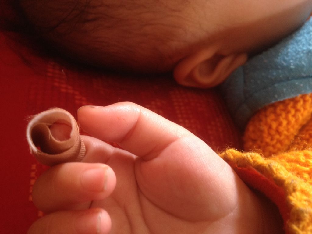 今天早上起来,我在梳头,宝宝做在学步车上走,不小心把我还没用过修眉毛的刀片拿出来,把手都割了,刚开