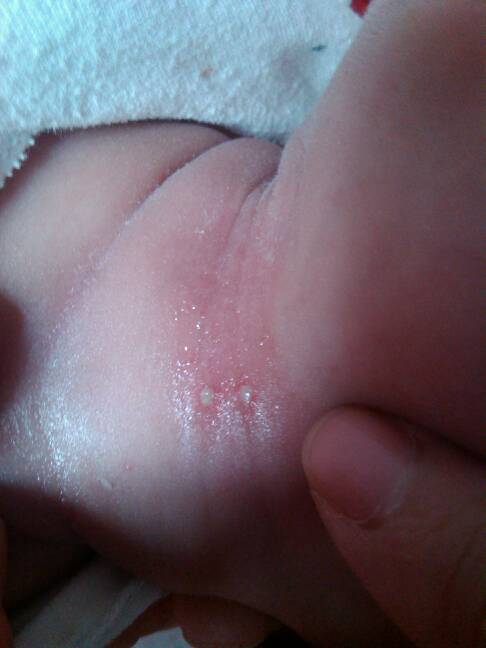 我家孩子今天30天了,脖子上长了这个,谁知道是什么?需要怎么医治?我刚刚给上了点红霉素软膏