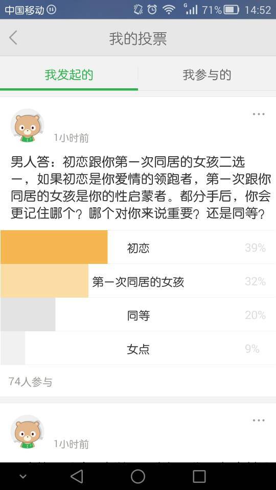 看别人选的好难过 为什么第一次跟你同居的女孩子就不重要呢?男孩子答,选第一次同居的女孩的举手✌ 点击展开 匿名用户 2015-07-08 14:53 推荐回答 因为虽然同居了。却没有性爱(近毯指女方不同意。) 至于初恋。那是印导北男孩子最难忘的一个人。宰涉 匿名用户 2015-07-08 14:56 宝宝知道提示您:回答为网友贡献,仅供参考。 为您推荐: 其他回答 第一个,中国老话说的好,一夜夫妻百日恩啊 匿名用户 2015-07-08 15:14 第一个 匿名用户 2015-07-08 14:59 第一个 匿名用户 2015-07-08 14:55 相关问题 现在还有多少女孩子能坚持婚前不同居? 我喜欢的女孩子不回我信息,我觉得好难过… 我爱一个女孩子,可她拒绝了我,我心里好难过,一直单恋着,我现在该怎么办呢?还有就是我没瘦哦,朋友说