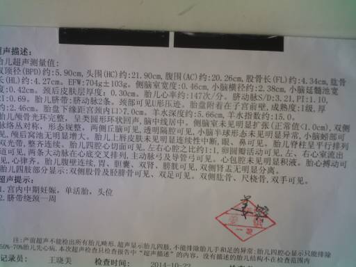 孕24周加3天三维彩超报告单正常吗? 孕24周加3天三维彩超报告单正常吗? 点击展开 ●__蕝蝂籹孓 2014-11-13 14:48 为您推荐: 其他回答 没事,好着呢! sunshine2015 2014-11-13 17:09 正常!!! 皓皓w 2014-11-13 15:47 你好,看报告结果提示胎儿在这次的检查中没有异常的,建议按时检查,祝你生个健康的宝宝 文斯6 2014-11-13 15:27 没事的,宝妈 ..._7dCO 2014-11-13 15:10 正常的、平时走动下 梓欣宝宝 2014-11-13 15:04 加载更多 相关问题 我现在怀孕24周加4天,今天去做彩超,孕检胎儿相当于26周加6天,这正常吗 孕27周加3天每天都要上好几次大便正常吗 孕19周加1天好像上火了,会不会对胎儿有影响