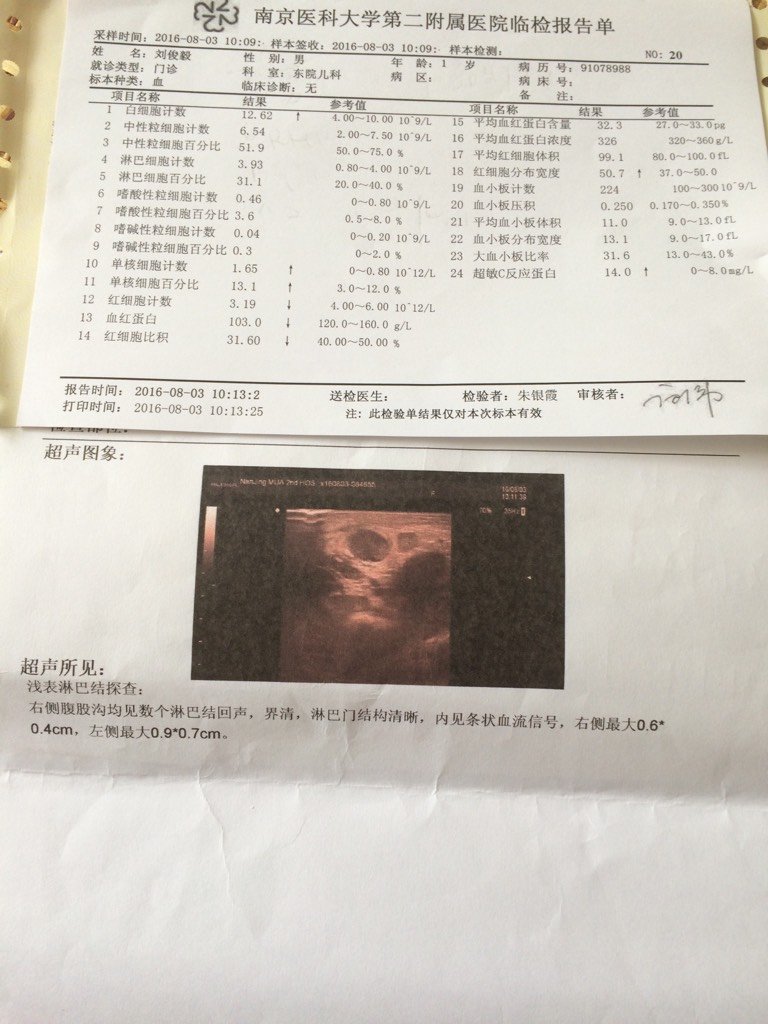 新生儿第27天,伴有两天低烧,37.5,现已退烧,左腿根部红肿块,已经去医院看过,说是淋巴发炎,找 新生儿第27天,伴有两天低烧,37.5,现已退烧,左腿根部红肿块,已经去医院看过,说是淋巴发炎,找的专家,也没说出因为所以,说是打三天消炎,请老师们帮我看下,内有检查报告 点击展开 Believe 2016-08-03 11:50 为您推荐: 其他回答 到别的医院在看一变 君媱 2016-08-03 17:21 还是去问下医生吧 小小心缘 2016-08-03 14:35 可以 xuehuo123456 2016-08-03 14:26 祝宝宝健康快乐 相伴^_^永恒 2016-08-03 13:46 不懂。。。 @小二 2016-08-03 12:14 加载更多 相关问题 43天宝宝腹股沟淋巴结炎,好治吗 孩子 在月子里经常低烧,都是物理退烧,喝 水,昨天又低烧,给孩子 婴儿77天,淋巴细胞偏高,中性粒细胞偏低,最近六天一直低烧(37 5以下,偶尔会退下去),最近两天 五个半月宝宝开始是低烧37 5,加咳嗽,化验淋巴细胞比值偏高一些,白细胞正常,医生说病毒性感染,给
