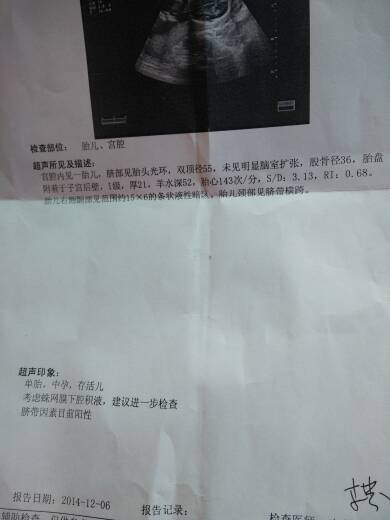 急,急,急,宝贝五个多月了,今天去医院做B超单子上显示胎儿右侧颞部见范围15*6的条状夜性暗区,请