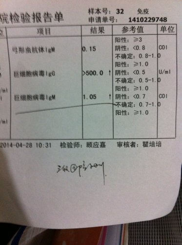 怀孕18周,血液检测巨细胞病毒值Igm偏高,怎么办? 点击展开 匿名用户 2014-05-03 09:05 为您推荐: 其他回答 病情分析: 你好,根据你描述的检查结果,以上结果是提示近期感染的表现 指导意见: 目前是需要进行抗病毒治疗的,平常注意个人卫生,孕中期需要做下相关排畸检查 匿名用户 2014-05-03 09:17 相关问题 我怀孕约24周,检查血液得知,巨细胞病毒IgM 大家好,我刚刚查出来怀孕了,血液检测是怀孕1至2周左右,但是我小肚子连续疼了一周,疼起来就想去上厕 最后一次月经开始是5月18号,现在检测是怀孕了,我想知道现在大概是几周,我需要补充什么吗?