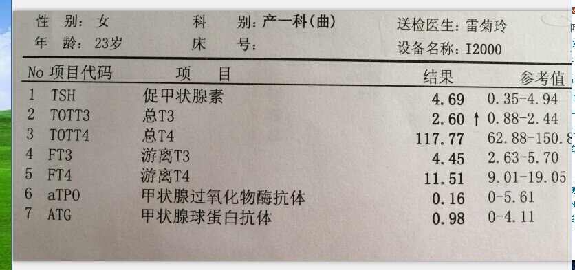 孕妇38周甲功七项 促甲状腺素和总T3是不是高了?有图,帮忙看是不是甲亢啊?对孩子有影响吗? 已经38周了,医生说对孩子有影响,但是是小医院,没到专门的内分泌科查看!请帮忙判定是否异常,需要专门检查吗?建议吃什么药? 点击展开 匿名用户 2015-01-13 15:34 为您推荐: 其他回答 甲亢的治疗有很多方法,要结合患者病情确定。 你好,通常可以药物治疗,如果严重或有手术指正必须手术治疗。 ҽ 2015-01-14 12:33 相关问题 各位宝妈: 请问这个时候查到促甲状腺素偏低,是不是就是甲亢?这个时候会有影响么?怎么会偏低的?有谁知道吗? 孕10周+及12周甲功检查不正常,是否孕期甲亢 孕妇有甲亢对孩子会有什么影响呢