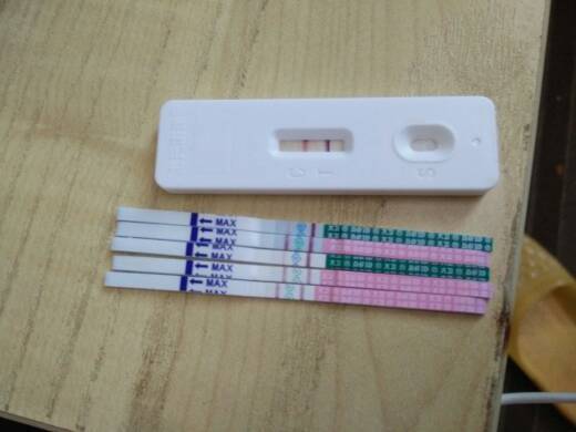 红条是排卵测纸呀!蓝色是早孕测纸,才月经第二十天怎么可能,昨天照阴超有个,27×23的优势卵泡,我