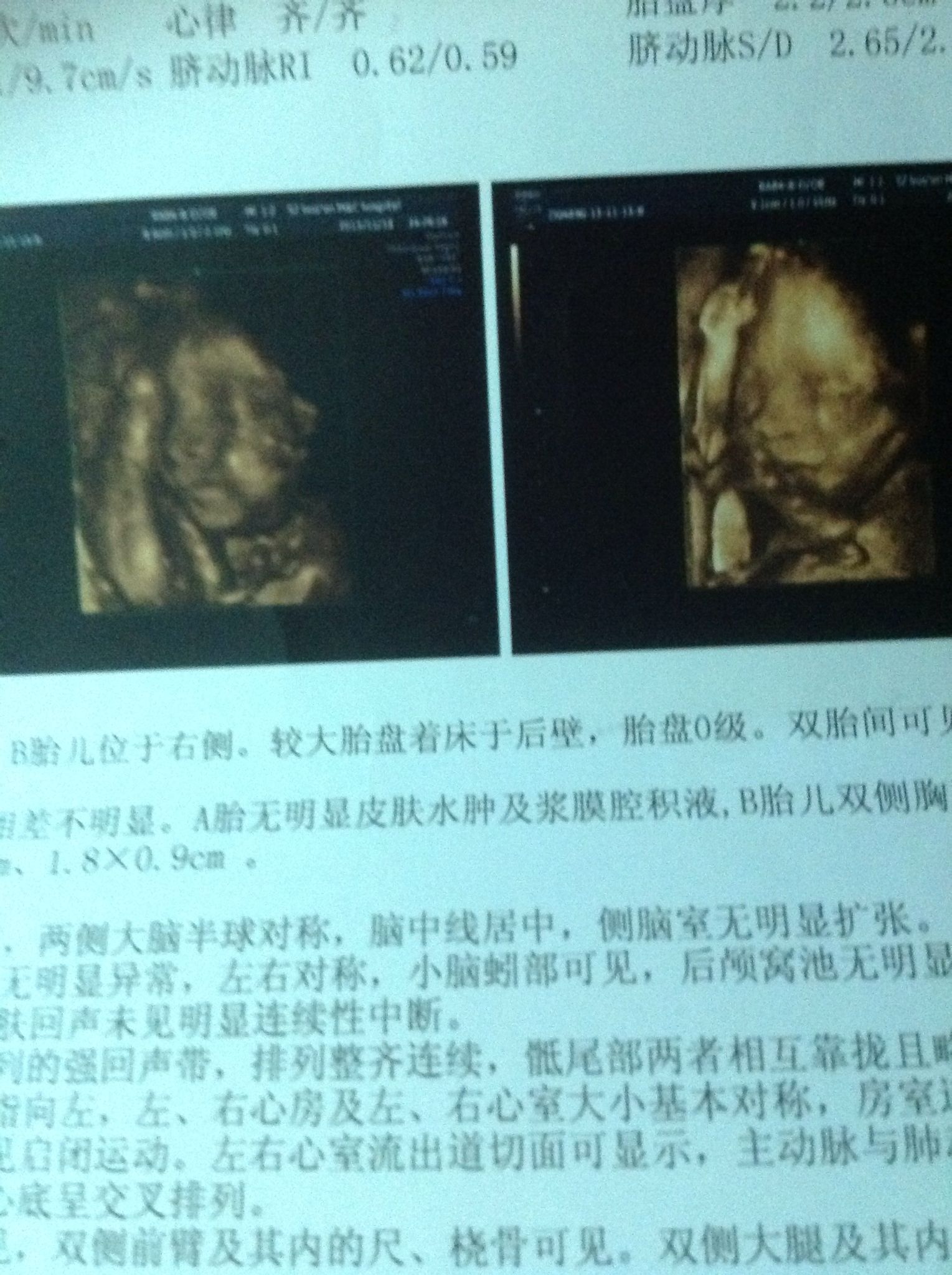 刚照的彩超,双胎,其中一胎儿双侧胸腔积液(3.9*0.7cm,1.8*0.9cm),胆囊偏大,脐带 绕颈。很想知道这个情况严重不?对孩子出生有影响吗?请帮忙解答一下,谢谢! 点击展开 匿名用户 2013-11-13 18:35 为您推荐: 其他回答 末次月经什么时候? 匿名用户 2013-11-13 18:53 相关问题 四维彩超显示胎儿左侧少量胸腔积液,羊水正常,其他的都正常这是怎么回事? 今天做了四维彩超,医生说胎儿胆囊有点高,听了后听担心的,有宝妈有过吗?