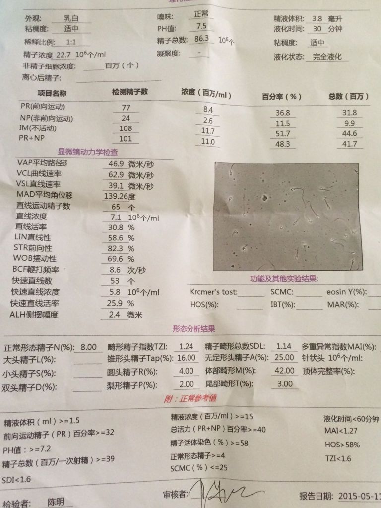 这是我老公禁欲三天后去做的精子质量检查报告,请问专业人士帮忙看看这对怀孕有影响没,万分感谢! 点击展开 匿名用户 2015-05-28 10:29 为您推荐: 其他回答 你好,精子质量检查报告基本正常。应该对怀孕没有影响, 建议多参加锻炼。戒烟。少去桑拿房、蒸气浴室。适度饮酒。少用化妆品。向麻醉剂说不。放松心态。把手机放在上衣兜。多吃绿色蔬菜。多吃黑色素含量高的食物。 113127 2015-05-28 11:16 相关问题 姐妹们,有没有人知道男的去医院检查精子质量前要禁欲几天 想生男孩,禁欲几天,精子质量最好 想生男孩禁欲多久精子质量最好最多呢?