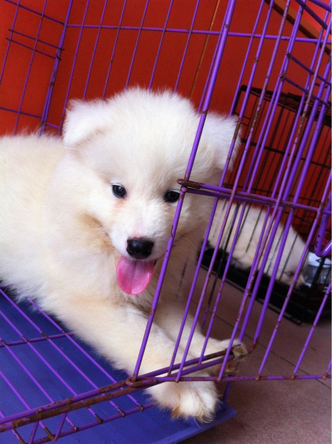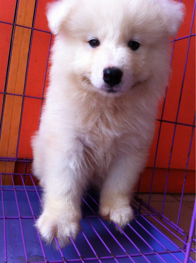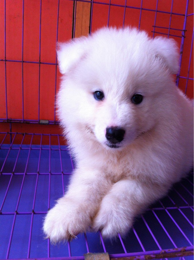 这狗狗是萨摩耶,但是品相不是很好,嘴巴太尖太长,眼睛不是杏仁眼,毛量不够,骨架马马虎虎!