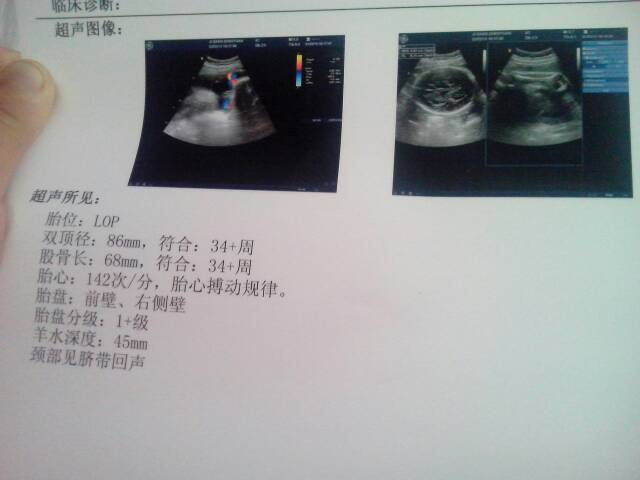 这是我三十四周的b超单子!请问宝宝多重阿!宝宝大不大呢 这是我三十四周的b超单子!请问宝宝多重阿!宝宝大不大呢 点击展开 love/宝贝/love 2014-06-03 12:32 为您推荐: 其他回答 病情分析: 你好,根据提示胎儿正常范围。 指导意见: 胎头位置是正常的,建议你不要担心了,是否能顺产,还要看骨盆,子宫收缩力,母亲的精神因素。 有法律制裁你的 2014-06-03 20:25 四到五斤 152*****093 2014-06-03 12:36 相关问题 b超单子上是32周了 是不是在过8周就40周了 就能生了 拍了个b超单子显示子宫畸形!对我的宝宝出生有影响吗 我五个多月了特不显怀孩子会不会小啊,B超单子还比我怀孕时间大两周