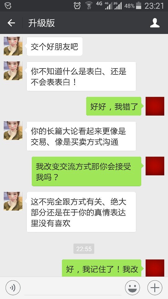 怎么和药沃你说呢 有些话我对很多人说过 男人为什么这么急着表白呢 追女孩子要沉得住气 明白震豆实吗?你要是真喜欢她 那就去关心体贴 切记别急着表白 那样女孩子没有安全感 大家高报接触多了 女孩子就觉得和你熟了 慢慢就建立信任 懂吗?