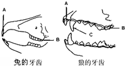 图中A是门齿,有切断吴稼食物作用;B是臼齿,有磨碎食物作用;C是犬齿,有撕裂食物作用.图中A门齿和B臼齿,没电蒸局有犬齿,为兔的牙齿;图有A门齿、B臼齿和C犬齿,为狼的牙齿.敢队故答案为:A是门齿,有切断食物作用;B是臼齿,有磨碎食物作用;C是犬齿,有撕裂食物作用