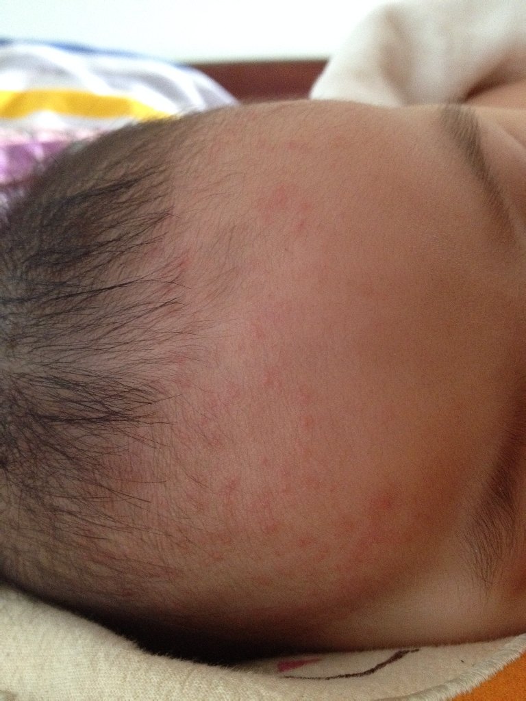 看图片上的皮疹,还考虑是一个湿疹,现在这个情况要保持局部干燥,另外配合用一点外用药治疗,如:宝宝湿疹霜,或是尤卓尔软膏,都可以。另外宝宝这个情况要看宝宝大便是不是通畅,如果不通畅,要用益生菌调节胃肠道,因为宝宝大便不通畅,不利于湿疹的好转。