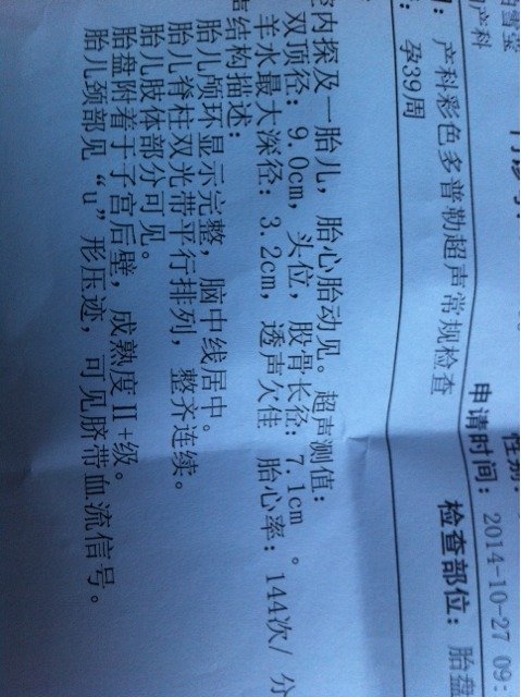 孕39周 双顶径9.0cm头位股骨长7.1cm羊水最大深经3.2cm透声欠佳 胎盘附着子宫后壁成熟