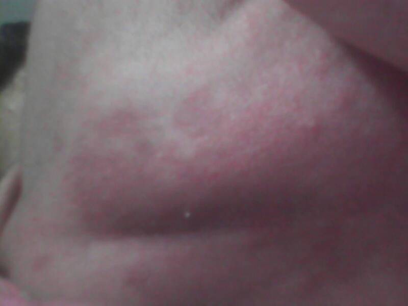 见大片的红斑,丘疹,你好,这个是过敏.多是因为饮食或者接触到什么而引起皮肤产生发炎过敏的现象,可以在患处外涂糠酸莫米松软膏,一天一次,药店有卖,有消炎止痒的作用