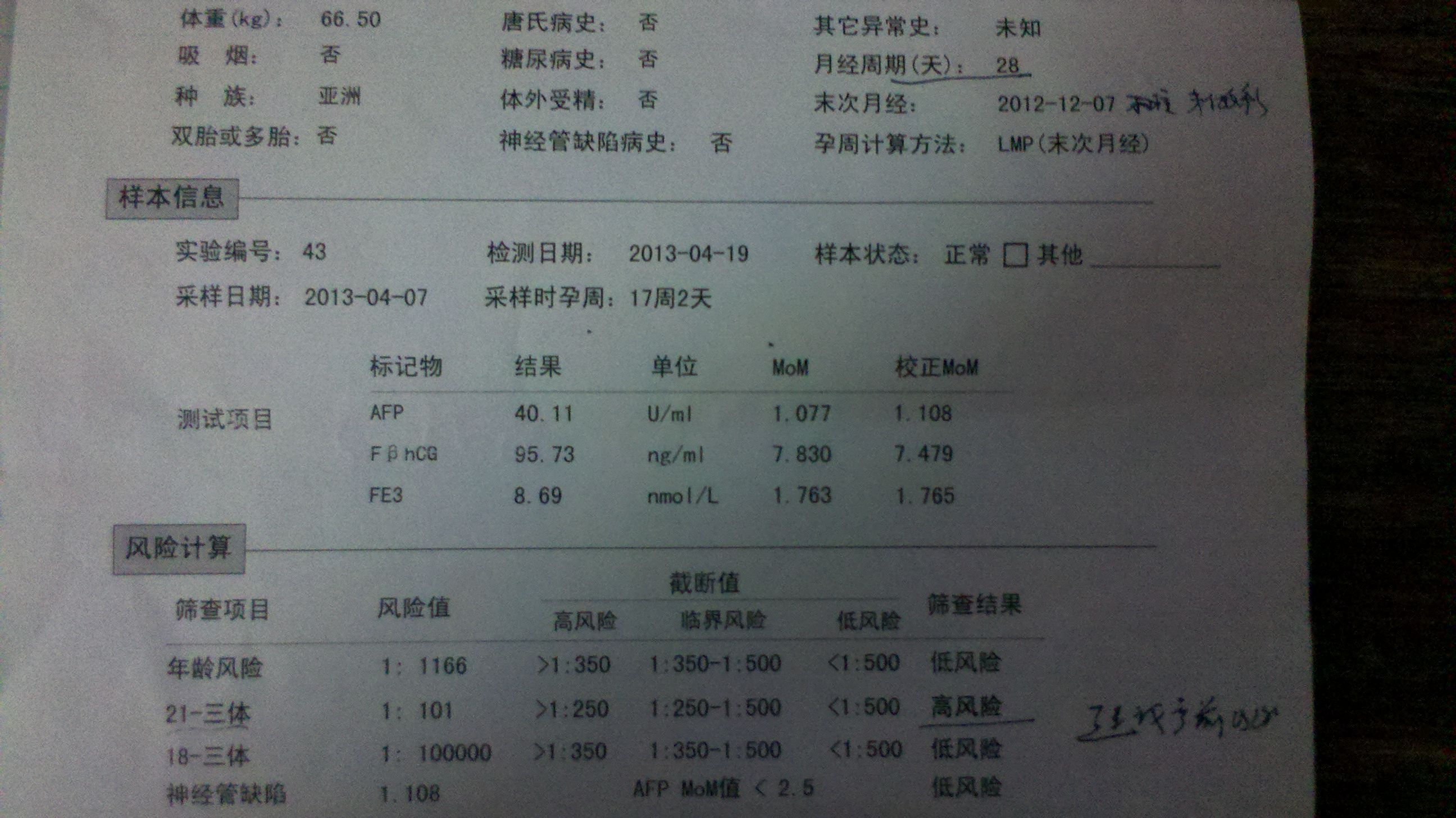 老婆现在怀孕第19周 第17周时候做的唐筛检查 下面是结果 有一项高风险 其他几项低风险