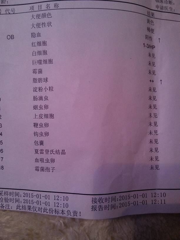 急 求大夫帮我看看宝宝的这张化验单,看看宝宝是怎么啦?宝宝的大便有血丝,暗红色的
