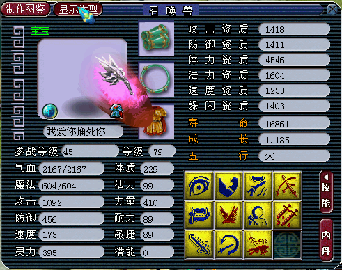 你这个是洗好了点的BB 你这资质我估计元宵炼兽都吃了 成长不太好 其他都很亮眼 高连跟高神基本都不是钱了 吸血必叹做杀都不算钱 这BB如果卖出去 别人一定是拿去上红书了 11技能的雷鸟 如果是3年上区应该最好卖 我觉得就是卖个胚子钱 (装备我不知道什么样的 就不侨兔说了) 只算这BB的话 应该能卖到1500-1800R 毕竟技能很多 老板狼岩患打完书带个SE套 用起来很爽