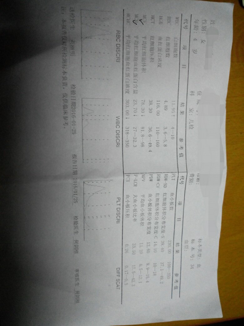 宝宝4岁前天我妈带去体检说不知哪方面有点偏高,她老人家回来又说不清楚,求解,附图 点击展开 匿名用户 2016-01-29 19:17 推荐回答 数据后箭头朝上的偏高,箭头朝下遮倘的禁缘铜偏低,从化验结果助它看:白细胞偏高,可能有炎症。 匿名用户 2016-01-29 19:56 宝宝知道提示您:回答为网友贡献,仅供参考。 为您推荐: 其他回答 一切正常,白细胞偏高可能是有点炎症。 母婴用户471046634 2016-01-29 19:21 白细胞数 匿名用户 2016-01-29 19:20 相关问题 我没有怀孕,抽血为什么HGC偏高呢,去厂里体检都不要,都讲可能怀孕了,好郁闷,时间不清楚 宝宝一岁四个月连续发高烧四五天检查时白细胞偏高怎么回事 宝宝现在一岁半了,今天体检说是贫血,宝宝不挑食,但是感觉吸收不好 饮食搭配应该怎么做呢?