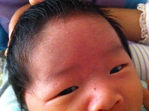 宝宝才两周多一点,但是前几天开始 他额头上 和眉毛上访 长出一块一块的东西,看上去有点干干的 还有