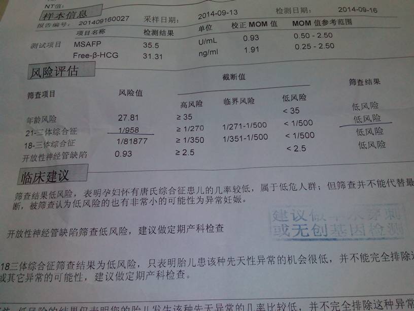 医生建议做无创基因检测,在苦恼做还是不做检查 医生建议做无创基因检测,在苦恼做还是不做检查。 点击展开 150*****921_kRRP 2020-10-11 08:16 为您推荐: 其他回答 你好,因为你的这个检查结果是有问题的,所以还是得注意一点比较好,不能排除胎儿异常的可能性的,你应该听医生的建议 一直在路上yw 2020-11-28 02:28 不用做都行了 伊人安静~~ 2020-11-12 11:02 因为你前期的检查有问题还是什么原因让你做,个人认为要是唐筛没问题可以不做。 忘忧草_5iix 2020-11-01 08:35 不做,,, 琳琳的小宝贝 2020-10-14 01:31 相关问题 医生建议我做无创性产前基因检测,要做吗? 四维显示胎儿左心室有个强光点,到底做不做无创基因检测??? 四维显示胎儿左心室有个强光点,到底做不做无创基因检测???