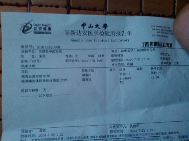 各位医师,请帮我看下我的化验单,有问题吗? 各位医师,请帮我看下我的化验单,有问题吗? 点击展开 小琪琪和小苹果 2014-07-23 18:06 为您推荐: 其他回答 梅毒是有可能遗传给胎儿的,建议你及时在医生的指导下治疗。 崇晟儿 2014-07-23 23:34 可以到疾控中心确诊检查。 崇晟儿 2014-07-23 18:24 如果经过治疗治愈了就不需要,如果没有治疗就表示已经感染。 崇晟儿 2014-07-23 18:16 你好,没什么太大的问题,梅毒抗体阳性表示曾经得过就会显示阳性结果。 崇晟儿 2014-07-23 18:10 相关问题 请各位医师帮我看一下化验单的情况 两个月男宝,咳嗽有痰,不发烧,求专业医师看看血液化验单 咨询产科医师,唐氏产前筛查结果化验单,结果如图