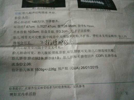帮忙看看30周+的彩超单子 帮忙看看30周+的彩超单子 点击展开 沉沦你的温柔 2014-11-16 21:22 为您推荐: 其他回答 如果可以见是正常的,如果是不可见就是不正常的,你都咨询下意识。 勤奋的菜鸟66 2014-11-17 19:33 你当时没问医生吗 你若不离不弃我必生死相依 2014-11-17 17:49 再去复查一次试试 你若不离不弃我必生死相依 2014-11-17 17:49 还是没搞明白你说的意思 你若不离不弃我必生死相依 2014-11-17 17:20 你好,你的单子不是很清楚的,建议你多咨询医生的,如果是有什么问题的,建议你让医生仔细检查清楚, 勤奋的菜鸟66 2014-11-17 15:41 加载更多 相关问题 亲们,帮忙看看彩超单子!28周的时候拍的 做唐筛多少个周比较好啊?做唐筛的同时必须做个彩超吗?要结合彩超单子吗? 我宝宝脐带绕颈两周了,看着彩超单子,感觉他好可怜的~