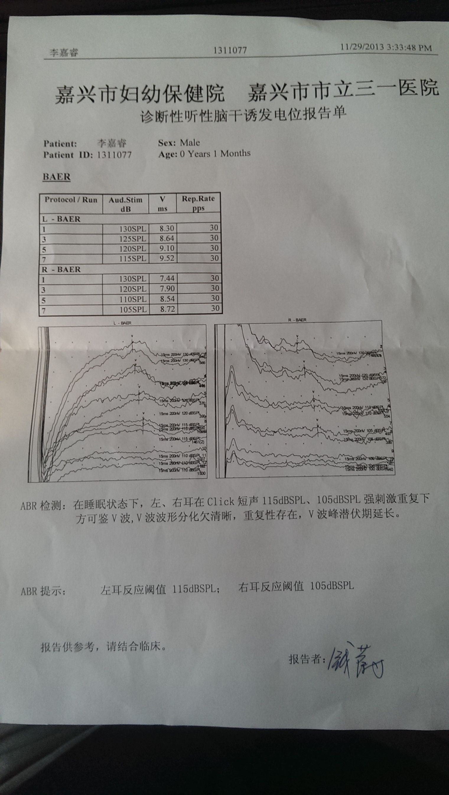 宝宝出生时医院体检双耳不过 天满月到市医院做听力诱发电位测试结果是: ABR检测:在睡眠状态下,左
