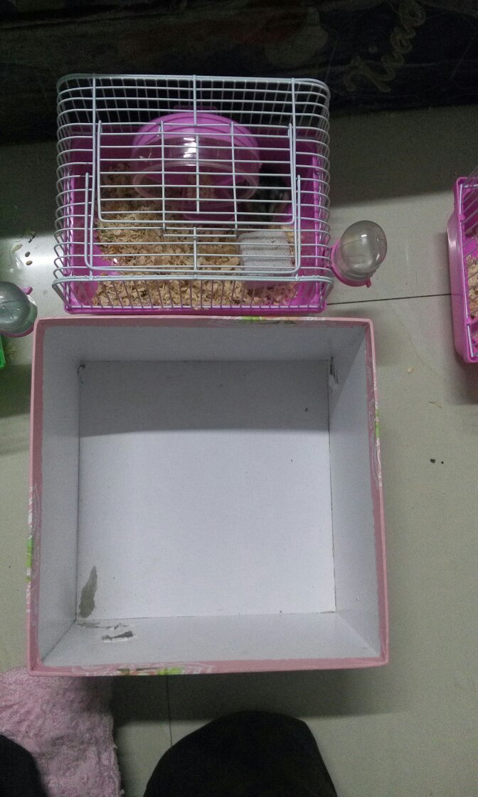 仓鼠怀孕了,要不要换到如图下面的白色盒子里呀?,现在住在上面的粉色小田园里面,,空间大点是不是会