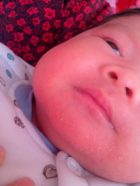 这是婴儿湿疹,也常叫做奶癣,婴儿湿疹要好好护理,远离过敏原,否则重者可发生大片红斑,其上为成群丘疹、丘疱疹、水疱、糜烂渗液,表面有厚痂,也可延及整个头面部或头颈部。病灶周围出现红斑丘疹、丘疱疹、水疱、自觉瘙痒。应尽快使用邦呗儿植物护理霜,避免湿疹加重。