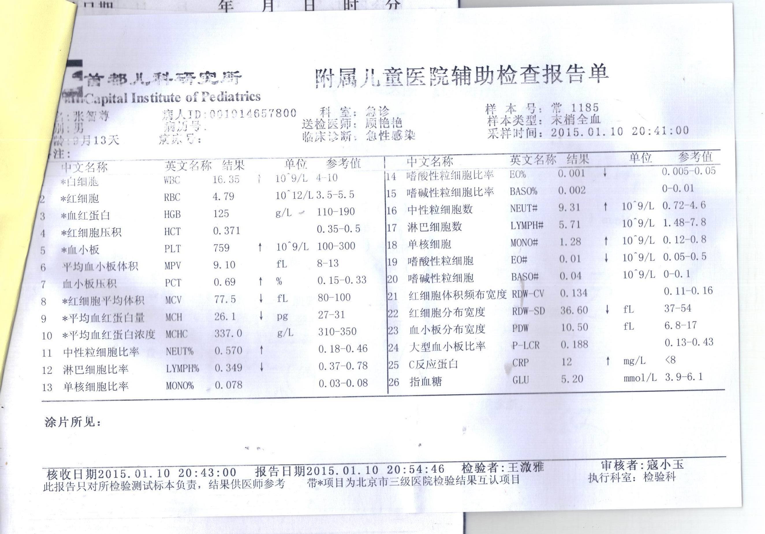 C反应和全血,这个检查和上海的差不多。儿研所听起来已经蛮大牌了,个人不是医生,只是自己孩子经常跑医院稍微有点经验,供参考。个人感觉白细胞高、C反应蛋白高,要考虑细菌感染。中性细胞过高和过低都提示有病毒感染。病毒和细菌合并感染的情况是存在的。具体如何治铜电涉疗还是听医生的。和医生好好沟通,一般能吃药的不打针,能打针的不吊针,可以和医生建议厉毫下,如果医生觉得情况复杂的,可能会让孩子吊针。不管怎样,小孩子得病趋北,硬扛是不可取的。是药三分毒,但是治疗需要也没办法。另外孩子的血小板高出很多。70万了。给他多喝点水,稀释一下,胜过服药吧