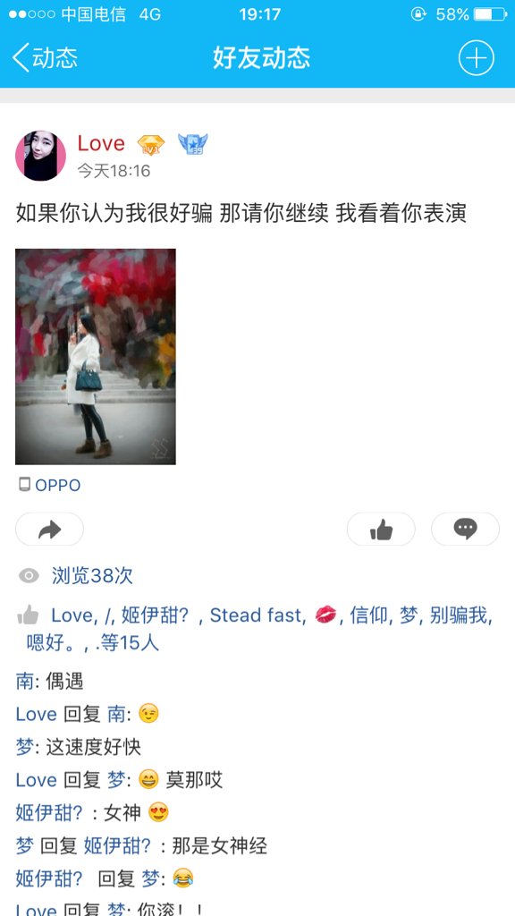 追一个女孩子,她以为我是骗她 想请兄弟姐妹们给我出个回复她的动态 点击展开 匿名用户 2016-02-10 23:11 推荐回答 在你面前,从来不说谎 匿名用户 2016-02-10 23:15 宝宝知道提示您:回答为网友贡献,仅供参考。 为您推荐: 其他回答 真喜欢直接打个电话...这种地方说不清的 匿名用户 2016-02-10 23:23 骗一辈子吧! 匿名用户 2016-02-10 23:20 草 母婴用户665840116 2016-02-10 23:15 是谁 匿名用户 2016-02-10 23:14 加载更多 相关问题 我追的女孩子有心事,心情不太好,我想让她说给我听,可是她不想说,我想兄弟姐妹们,帮我想想,怎么样可 我和兄弟在同一个公司,大家都知道他在追一个女孩 我们都在同一个办公室 慢慢的我发现女孩子喜欢上我了 我和我的好兄弟喜欢上同一个女孩子 但那女孩子明确拒绝过我兄弟了 我感觉那女孩子有点喜欢我 如果我和