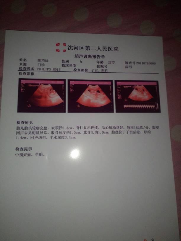 做了彩超忘记问医生情况就回来了,可以帮我看看吗,孩子几个月了? 做了彩超忘记问医生情况就回来了,可以帮我看看吗,孩子几个月了? 点击展开 承諾, 2014-07-16 15:13 为您推荐: 其他回答 好清楚阿。多少钱 一个人。 2014-07-16 16:43 你上面写的中期妊辰宝宝应该有三个月多了 何 必 再 忆 2014-07-16 15:30 没事。有时候这里面医生不靠谱的。 她外表丑陋却内心善良# 2014-07-16 15:22 那你怀孕三个月左右。你去百度查下中期妊娠是大概几个月。 她外表丑陋却内心善良# 2014-07-16 15:21 怀孕中期基本是5/6个月左右吧。 她外表丑陋却内心善良# 2014-07-16 15:19 加载更多 相关问题 怀孕29周了,这是今天做彩超的单子帮我看看有什么问题,医生说没什么 但是我还是很担心 今天做了彩超医生说孩子有七斤多,到底是要顺产还刨妇产呢? 46天的时候做彩超孕囊1 5*1 0cm现在八周+3孕囊3 3*2 2,有胎心了,就是医生说孩子有