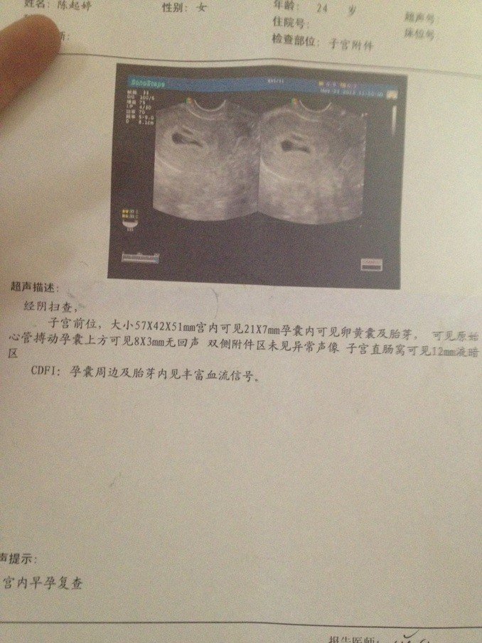怀孕四十几天b超结果显示孕囊周边及胎芽内见丰富血流信号,医生说可能是双胞胎,又或者是先兆流产,求解 点击展开 匿名用户 2013-05-24 16:31 为您推荐: 其他回答 两种可能都会存在,但是,双胎的可能性略大。不过,都还是需要时间观察的。我们同样等待中。 ֲ 2013-05-26 18:21 相关问题 超声检查52天可见卵黄囊和胎芽,可见闪烁血流信号,医生说比实际孕周要小,有先兆流产在保胎中,血貌似已经不流了,为什么听不到胎心是因为太小了吗? 怀孕26周B超显示脐动脉血流信号消失,一周后复查还是这样,请问这个宝宝我还能不能要?还是现在提前把 为什么有先兆流产,医生给我开了一个星期药,到现在还有血流出来