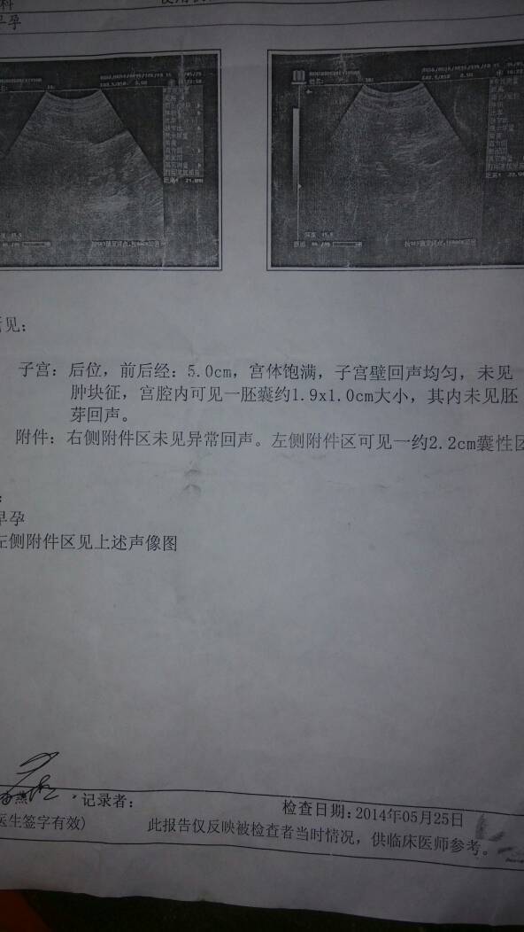 大家帮我看看吧,当初45天的时候,第一次就做了个B超,看起来结果是没胚芽和胎心,但是医生也没叫我检