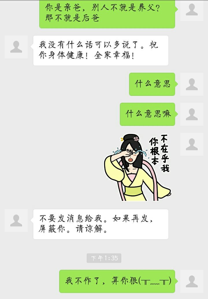 我和他说 介绍你朋友给我认识,说不定孩子有养父了,他的话什么意思,我怎么看不懂?他是生气了吗? 点击展开 火焱悠 2016-09-14 14:11 推荐回答 你和他什么关系? 匿名用户 2016-09-14 14:14 宝宝知道提示您:回答为网友贡献,仅供参考。 为您推荐: 其他回答 操吧操吧,当两个男人的精子相遇,总是先厮杀一番,然后胜的一方有后代,当然最好的情况就是获胜的精子不小心重伤不治,死了。 匿名用户 2016-09-14 14:55 你是不是骚扰人家来着啊 匿名用户 2016-09-14 14:15 你这样是不是很无聊啊 匿名用户 2016-09-14 14:15 分吧 匿名用户 2016-09-14 14:13 加载更多 相关问题 医生你好!请问一下,我女朋友怀孕六个多月,她今天生气吃了三板芦荟片,请问对孩子有影响吗? 宝宝今天23 天了,我想给她带尿不湿,可是婆婆说别带那么早,带的早了孩子罗圈腿,我听了很生气,朋友