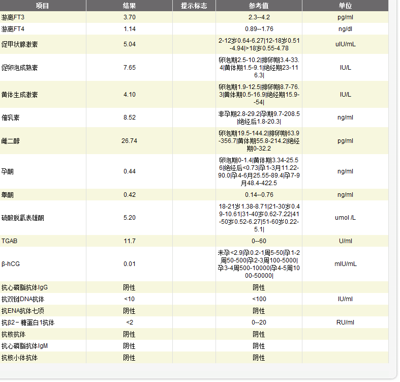 月经结束第一天查的性激素六项 麻烦各位帮我看看是否正常 点击展开 匿名用户 2013-03-02 15:54 为您推荐: 其他回答 挺好的啊 hengzhengchang a 匿名用户 2013-03-02 16:42 挺好的啊,是月经第几天抽的? 匿名用户 2013-03-02 16:16 你多大啊? 匿名用户 2013-03-02 16:05 相关问题 月经期第二天查的性激素六项,麻烦帮我看看正常么、 排卵是从月经来的第一天算还是月经结束后开始算 孕妇怀孕是从月经刚来的第一天算、还是月经结束的那天
