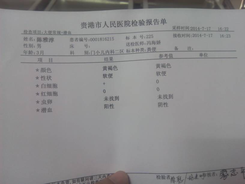 请问这份检验报告单说明什么问题? 请问这份检验报告单说明什么问题? 点击展开 观弈道人 2014-07-17 16:36 为您推荐: 其他回答 你好,根据你的化验单来看,宝宝的大便里有白细胞,可能是消化道感染所致。潜血试验阳性说明大便里有红细胞,可能宝宝的消化道有出血的情况。 hfh194 2014-07-17 16:52 相关问题 看下这份检验报告单可有什么问题? 急急急!!!求助,希望好心人帮忙看看这份白带检验报告单,到底是什么毛病?用什么方法能治好呢?谢谢 急急急!!!求助,希望好心人帮忙看看这份白带检验报告单,到底是什么毛病?用什么方法能治好呢?谢谢