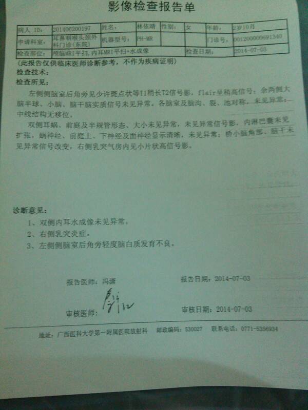 我小孩两岁十个月了,昨天去做了个磁共振结果说到什么都正常,就是左侧侧脑室后角旁轻度脑自质发育不良 我小孩两岁十个月了,昨天去做了个磁共振结果说到什么都正常,就是左侧侧脑室后角旁轻度脑自质发育不良。这样我们应该怎么办?严重不严重,吃什么能补充营养? 点击展开 匿名用户 2014-07-05 09:51 为您推荐: 其他回答 你好,这个是没事的呢,这个是可以很快就是会自愈的呢, 你是可以等过一段时间的时候去复查一下的啊 可靠的悠闲80 2014-07-05 14:12 相关问题 2岁宝宝,脑磁共振会显示双侧侧脑室旁异常信号,终未带?正常吗 你好 麻烦问你件事 怀孕29周查出来胎儿侧脑室宽1 1、做了磁共振没有发现明显异常 但是要观察请问得脑 孕32周侧脑室增宽1 13,磁共振查出脑结构没问题,一个月后复查吸收,宝宝还会有问题吗