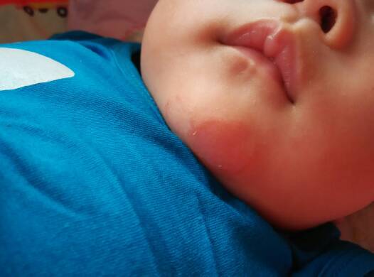 宝宝下巴有一片红色,出生时候就有 现在开始破皮,起特别小的泡泡 而且旁边也开始起了一片 变得大了